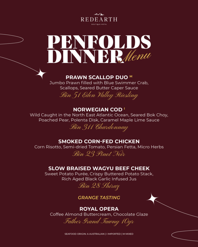 Join us for a luxurious 5-course dinner, with each course carefully paired with a Penfolds wine.